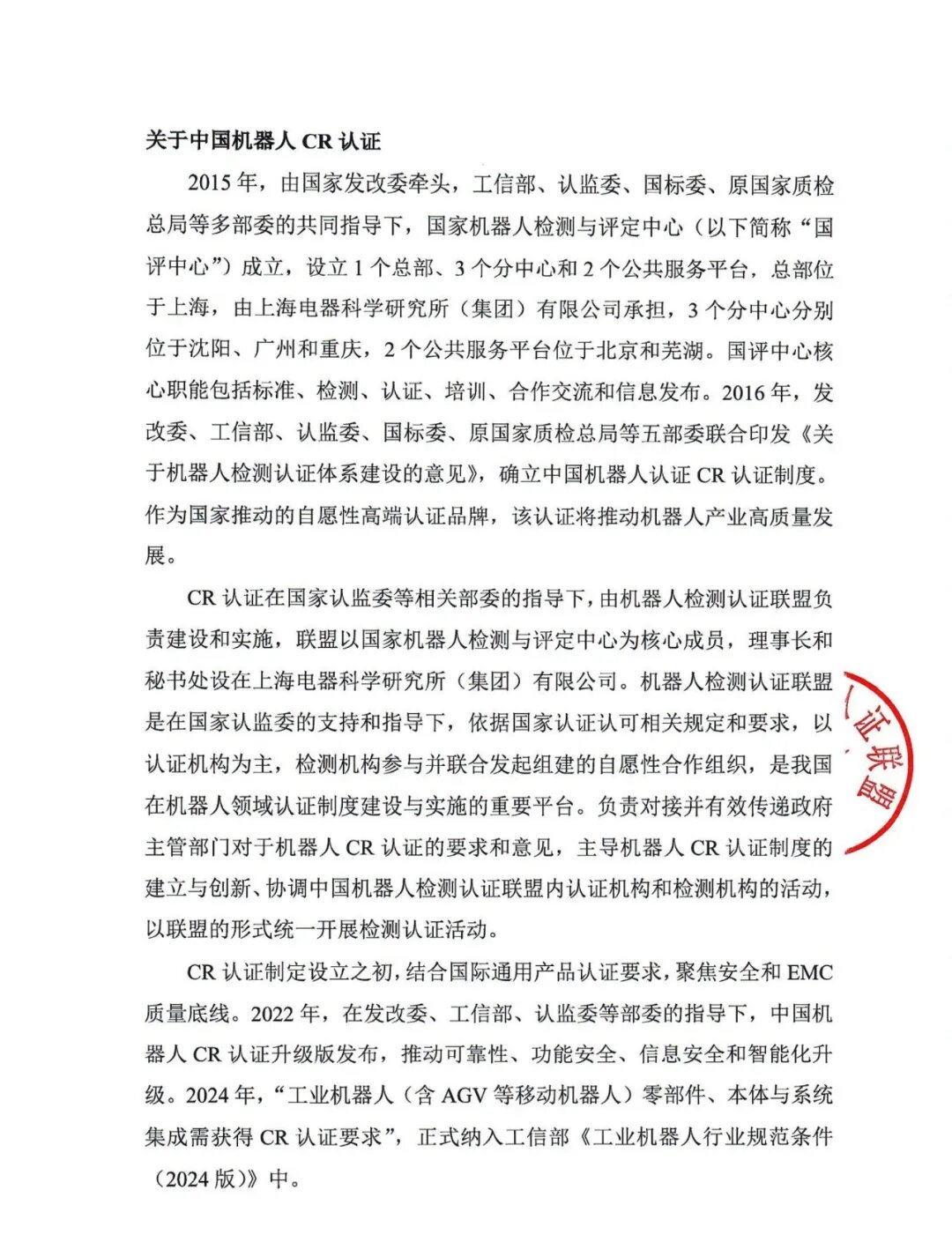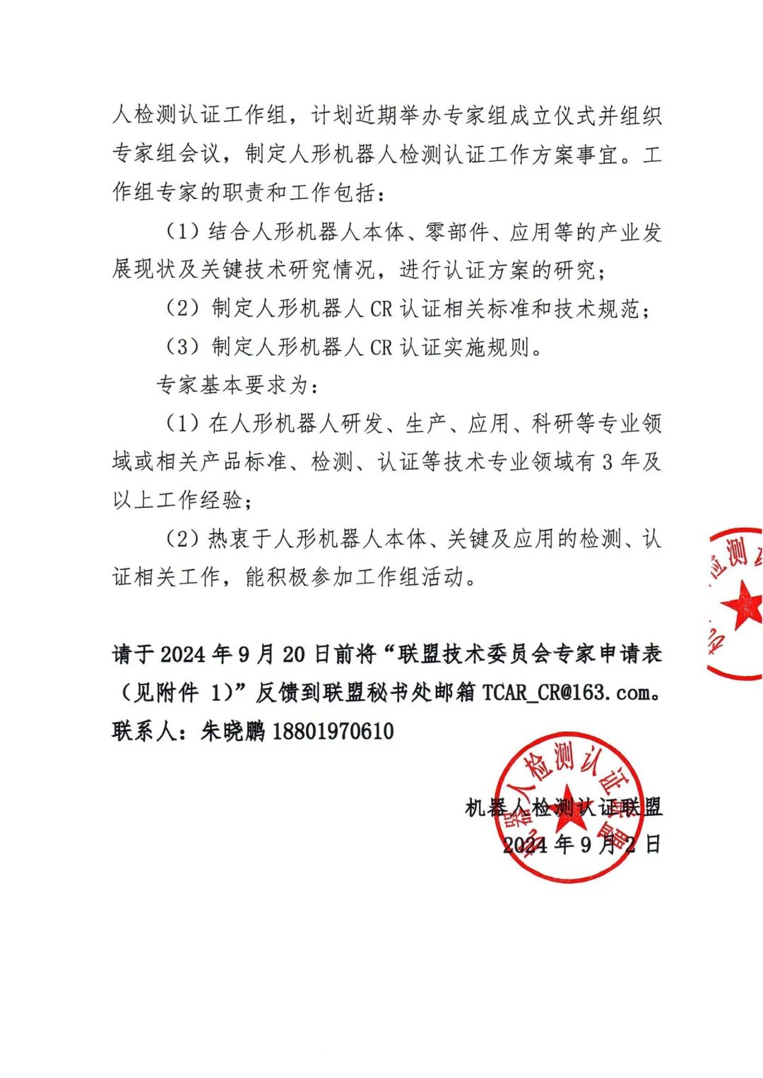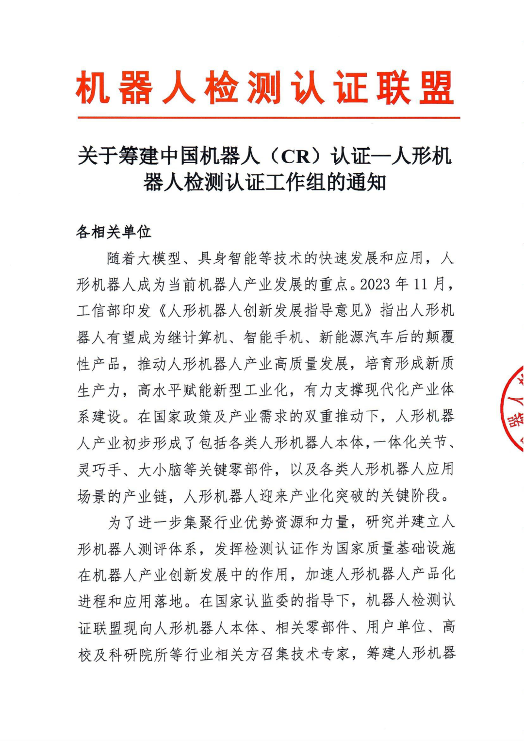 通知原文:关于筹建中国机器人(CR)认证——人形机器人检测认证工作组的通知.pdf