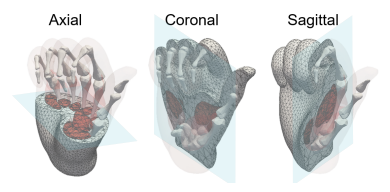 模板模型分为三部分,分别是骨骼、肌肉和外表面,其中肌肉和外表面模型用四面体建模。