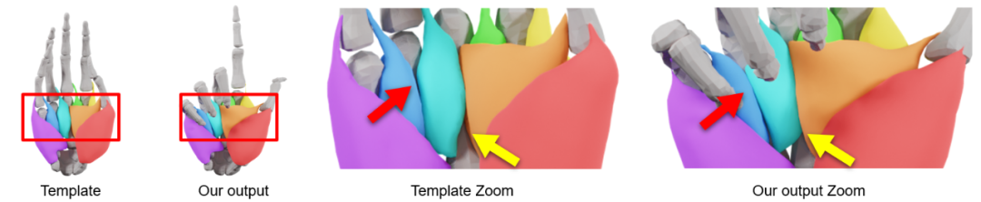 (b)(c) MANO 在形变时没有考虑内部结构,因此用简单的方法为它加上内部结构后会出现奇怪的肌肉和骨骼形变以及不真实的皮肤凹陷,而 NIMBLE 保持了解剖学上正确的和物理上合理的变形。