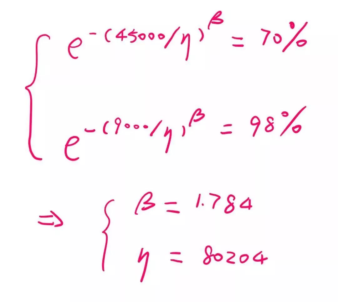 可现实情况下,机器人研发往往很多零部件的失效分布的形参是未知的。这就无法通过上述方法来制定可接受的可靠性定量测试。我个人的做法是通过产品设定的不同时间点可靠性指标来计算出一个形参。例如,某产品的目标寿命为10年(按实际工况换算为45000小时)70%的可靠性,置信度为80%;同时还有保证2年内(按实际工况换算为9000小时),累积失效不超过2%。那么,我们就可以根据威布尔可靠性公式来列出方程组,求出相对应的形参和特征寿命: