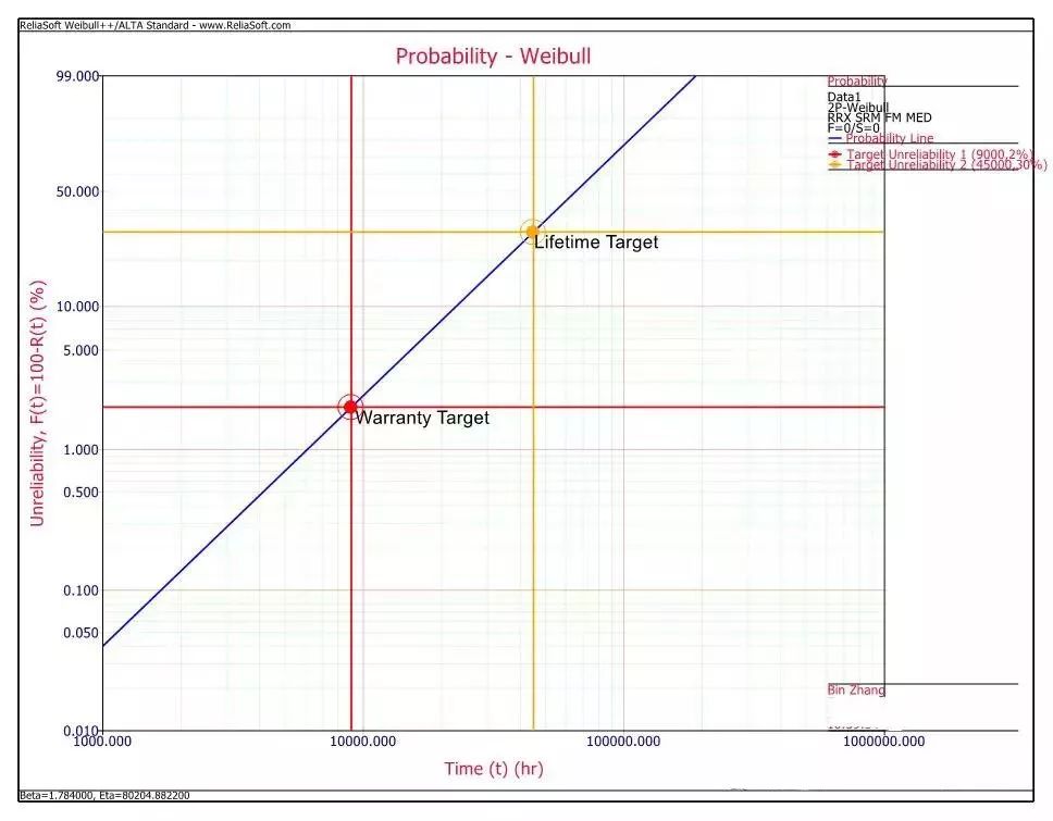 通过上图的对比,可以看出在使用工具设计可靠性测试方案时,尽管寿命目标值一样,但是选择不同的分布类型(考虑了warranty target的两参数威布尔分布)对测试效果还是有显著的区别。