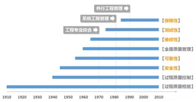 可以这样总结,过程质量检验、过程质量控制是经典的传统的方法,70、80年代是全面质量管理。在这个过程中,可靠性逐渐发展了维修性、测试性、保障性等概念。维修性指的是要好修;测试性指的是维修的过程中要能快速进行故障定位、诊断;保障性指的是在维修诊断的过程中,要能够提供足够多的资源、备件、维修人员、维修设备、维修设施等。