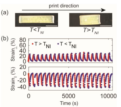 之前也出现过很多可以变形的液晶弹性体制动器,但是该项目显示了在高操作温度的条件下具有空间编程顺序,并直接用墨水书写的3D打印弹性体。