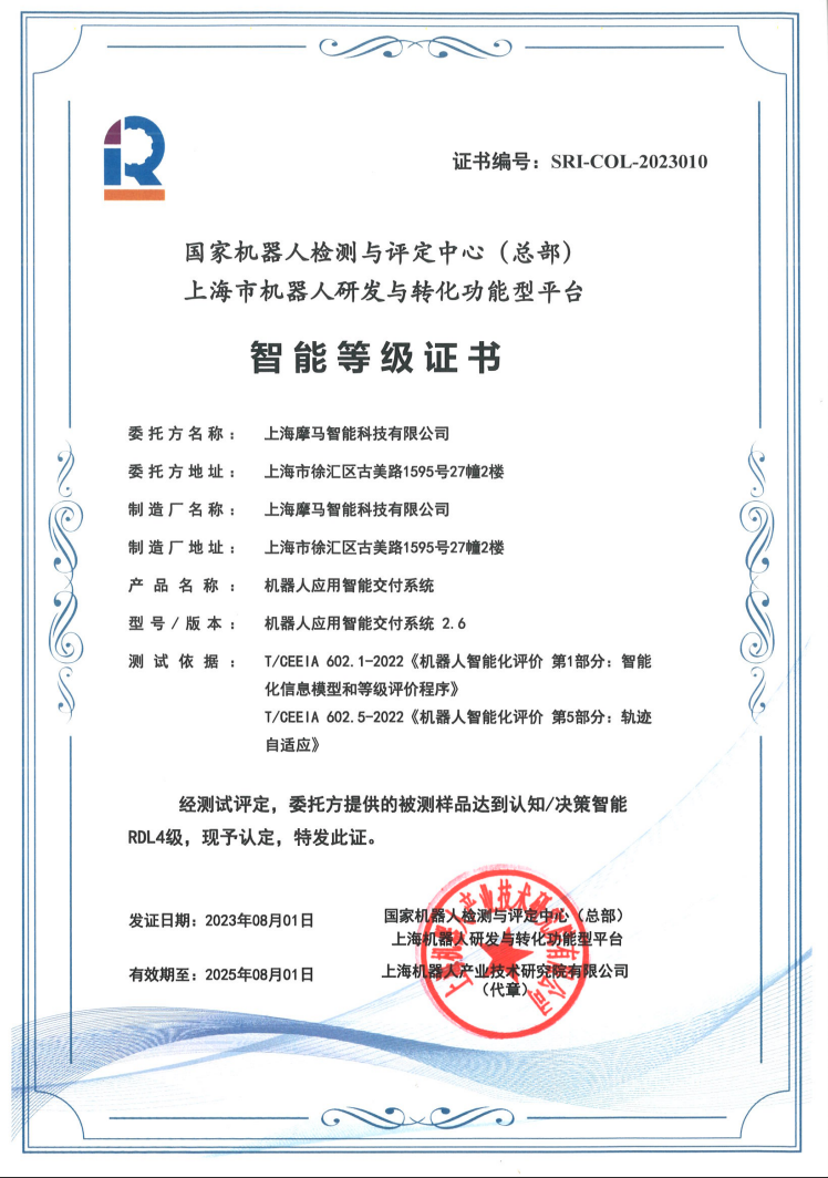 近日,星空xk(中国)机器人有限公司官网(以下简称“星空xk”)为上海摩马智能科技有限公司(以下简称“摩马智能科技”)颁发了智能机器人分级首张工业机器人领域认知/决策RDL4级证书。这表明由摩马智能科技机器人应用交付系统所赋能的工业机器人已满足智能机器人认知/决策RDL4级评价要求,摩马智能科技成为了首家拥有工业机器人认知/决策RDL4级等级证书的企业。